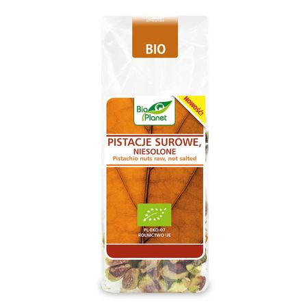 SKŁADNIKI pistacje łuskane, surowe, niesolone* 100% (*certyfikowany składnik ekologiczny)   OPIS Ekologiczne orzeszki pistacjowe to owoce pistacji właściwej (Pistacia vera), mają postać owalnego pestkowca przypominającego nieco oliwkę i należą do jednego z najbardziej odżywczych gatunków orzechów. Znane również jako zielone migdały. Ekologiczne pistacje nieprażone i niesolone, to wyśmienita samodzielna przekąska.