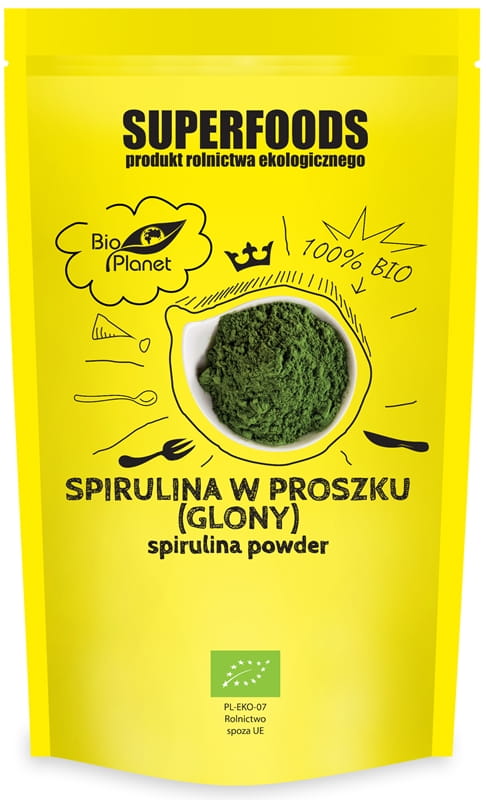 Ekologiczna spirulina to rodzaj zielononiebieskiej mikroalgi o kształcie spirali. Ta słodkowodna alga dostępna w formie sproszkowanej pozyskiwana jest z najwyższej jakości glonów z kontrolowanych upraw. Jej nazwa pochodzi od spiralnego kształtu, jaki naturalnie przyjmuje. Zawiera naturalny barwnik chlorofil. Jest źródłem błonnika oraz wyróżnia się bardzo wysoką zawartością pełnowartościowego białka roślinnego.